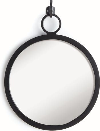 This sleek black round iron frame is an inspired look. The robust frame creates a bold focal point while the oversized hook pulls the frame away from the wall for a more dynamic look. Perfect for powder room, bedroom or study. Adding a mirror to any space in your home highlights your light sources while making the room feel more dimensional.