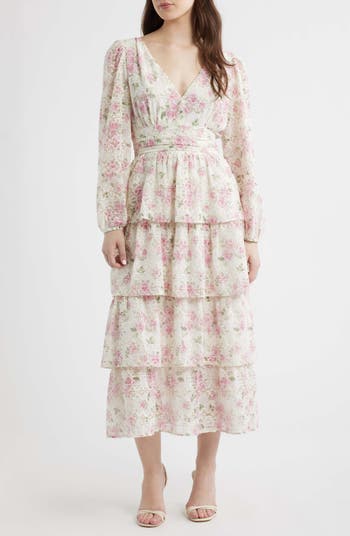 Vintage-inspired blooms enhance the enchantment of this maxi accented with airy embroidered eyelets and finished with a flouncy ruffled skirt.