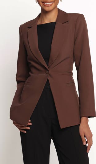 A one-button closure and tie belt create a cinching silhouette on this sophisticated blazer.