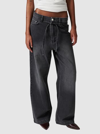These low-rise, straight-leg jeans feature five pockets, a zip fly with button closure, and a removable tie belt at the waist. The jeans have a loose fit.