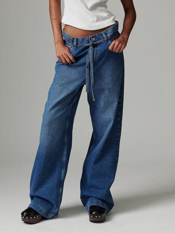 Relaxed low-rise silhouette, voluminous wide legs and a tied waist create a long drape for confident, casual allure.
