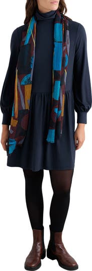 A drapey drop-waist hem adds swingy movement to this lightweight dress framed by a sophisticated turtleneck and billowed sleeves.