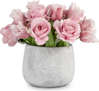 Delicate and refined, the Elio RealTouch Rose and Tulip Arrangement brings a soft, elegant touch to any space. Set in a chic cement vase, this arrangement features a harmonious mix of light lavender parrot tulips and velvety roses, each crafted with exquisite detail. The understated beauty of this piece makes it an ideal accent, adding a graceful pop of color and sophistication to your home. A lasting luxury, timeless and unrivaled.