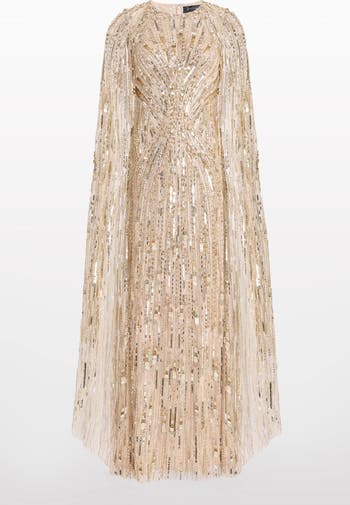 This full-length gown is defined by intricate embellishment arranged in precise, elongating lines that contour the body with effortless elegance. A sleek silhouette is balanced by fluid movement through the sleeves and skirt, creating a striking interplay of structure and softness. Designed to command attention while remaining refined, it offers a beautifully sculpted finish from every angle. Ideal for red carpet moments, black-tie galas, and the most glamorous evening occasions.