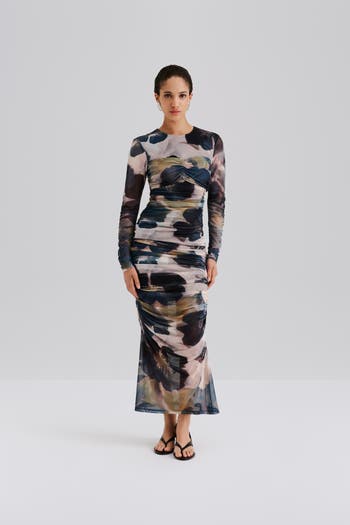 Elionora Jersey Dress with long sleeves and ruched details, perfect for elegant occasions and casual outings. Mix of polyester and elastane for easy movement and style.