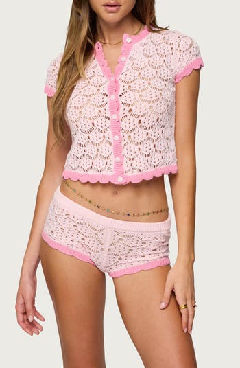 Keep it cute and playful in this scalloped-trimmed, open-knit cardigan with a cropped length that makes it perfect for beachy hangouts and festival-season 'fits.