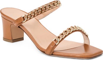 Chain-link hardware saunters over the slim leather straps on an Italian-made slide sandal lifted by a chunky block heel.