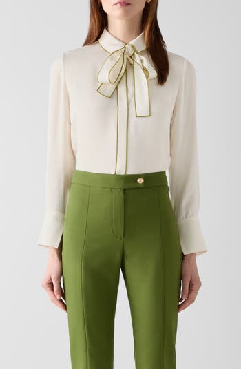 A delightful neck tie adds polish and charm to this smooth shirt outlined in contrasting piping.