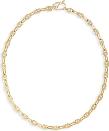 A sparkly toggle clasp can be worn to the front or back on this mariner-chain necklace plated in 14-karat gold for all-around glow.