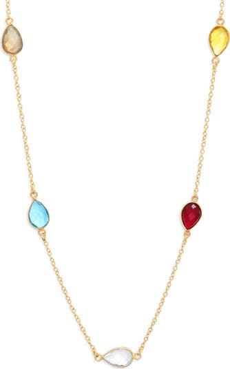 Delicate teardrop stations of brightly hued quartz light up this long necklace that easy to layer and makes a stylish statement when worn solo.