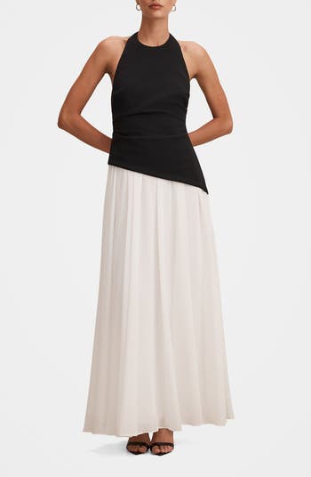 Build out your black-and-white collection with a one-and-done dress that reads like a gently draped halter top paired with a swishy, andkle-skimming skirt.