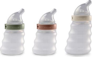 This set of digestion-friendly baby bottles made with German silicone has an ergonomic grip that mimics natural breastfeeding and a leak-proof, easy-latch nipple for comfortable, slow-paced feeding. They feature a tapered shape designed for upright feeding which helps reduce colic, gas and digestive discomfort and an advanced dual-venting system to prevent air ingestion.