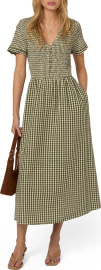 Cheerful gingham checks enliven this flared midi cut from breezy cotton and topped with a textured close-fitting bodice.