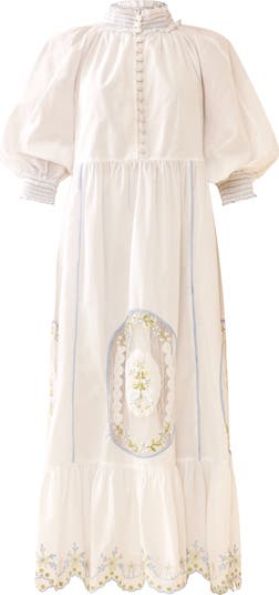 Crafted in 100% cotton, the Eliza Maxi is detailed with sheer white lace mesh that is finished with a combination of embroidery and lace trim details. Floral Embroidery details offering eye-catching design details that stand out against the soft white. Easy fit dress that flows over your body. Smocking details at the necklace as well as the elbow sleeve, fabric covered buttons that offer coverage options. Finished with a pleated ruffle.
