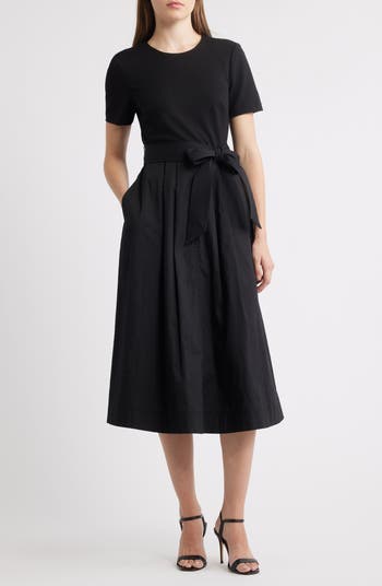 A channel-quilted bow wraps the waist of a modest midi dress designed in a softly flared silhouette.