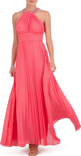 A bejeweled neckline elegantly accessorizes a shoulder-showing gown swirled in pretty pleats.