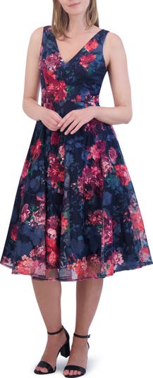 Bring the garden to the party in a blossom-tossed dress finished with a full skirt.