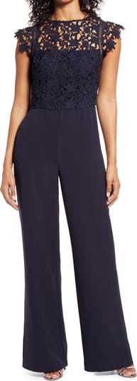 Lacy floral delicately decorates the fitted bodice of this elegant jumpsuit that's party perfect.