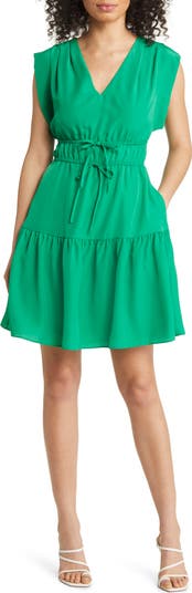 Drawstring waist detailing shapes the silhouette of this classic dress featuring a tiered skirt and handy pockets.