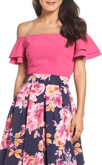 Bold color saturates this striking crepe top made even more dramatic with flouncy ruffled sleeves. Princess seams ensure a flattering fit for the off-the-shoulder silhouette.