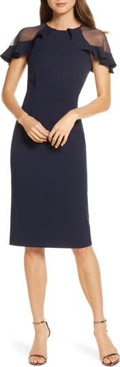 Shapely and sophisticated, this scuba-crepe frock features sheer shoulders trimmed with decadent frills.