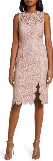 Lacy blooms landscape a figure-skimming dress winked with eyelash lace at the edges and finished with sweet scallops at the hem.