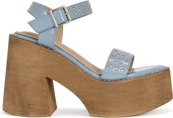 For your summer backyard dinner party.Wood platform sandal with a soft baby blue faux leather upper and clean gold flat studs-fresh, playful, and effortlessly elevated.Heel height: 4"Platform height: 2"