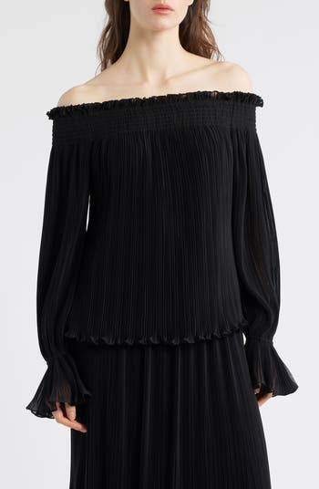 Fine allover pleats enhance the texture of this blousy frill-trimmed top made in a shoulder-showing silhouette and framed by flouncy bell cuffs.