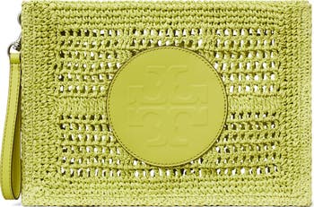 Crocheted raffia and a wrapped double-T logo add a breezy flourish to a compact pouch fitted with an optional wrist strap for hands-free carry.