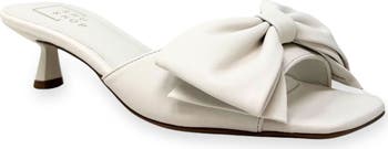 A voluminous bow amplifies the charm and dimension of a minimalist slide sandal featuring a square toe and kitten heel for comfortable balance.
