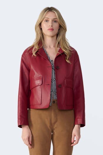Elevate your layering with this cropped leather jacket, crafted from genuine premium leather for lasting quality and a polished finish. The lightweight construction and modern, waist-length silhouette offer comfort and versatility for transitional weather. Handcrafted details and a statement button front closure provide a refined structure, while oversized patch pockets add functional style. Designed to endure season after season, this jacket is ideal for pairing with skirts, trousers, or dresses for a sophisticated touch. Smooth leather with subtle sheen and precise seam detailing ensure a timeless look. Leather jacket, cropped silhouette, button front, premium leather, transitional outerwear, modern fit, patch pockets, structured seams, imported from Turkey, shipped from the USA.