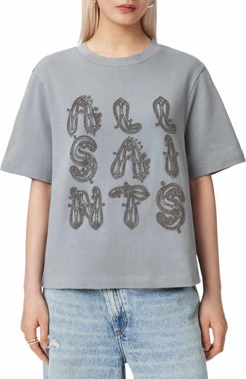 Signature lettering spelled in gleaming beads brings standout texture to this boxy tee made from soft cotton.