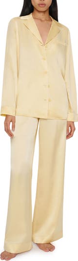 Bring luxe glam to your bedtime routine with this slinky silk pajama set featuring an oversized button-up shirt and matching wide-leg pants.