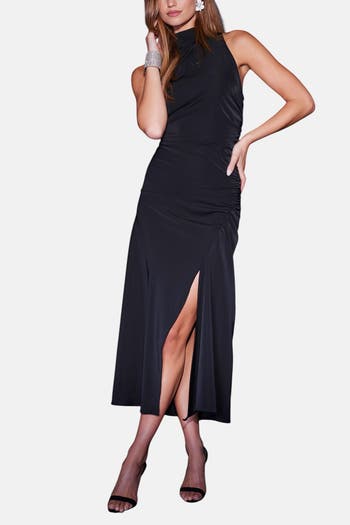 Halter dress with side ruching and a slit detail.