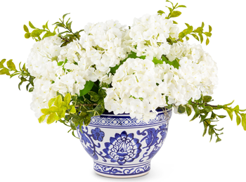 Fresh, crisp, and effortlessly elegant—the Elle Toile arrangement features lifelike RealTouch snowball hydrangeas paired with soft greenery for a natural, garden-fresh feel. Set in a beautifully crafted toile bowl, this arrangement brings timeless charm to any space. Whether placed on a console, countertop, or dining table, it adds a light, graceful touch—no watering required. A lasting luxury, timeless and unrivaled.