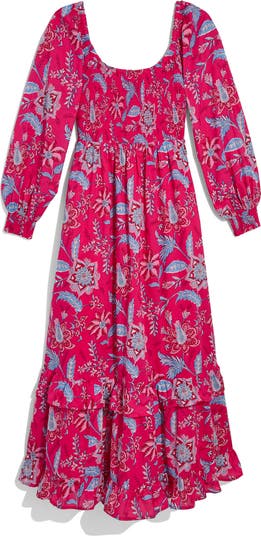 A smocked bodice gives a perfect fit to every wear of a cotton maxi dress framed by voluminous sleeves and cut with a tiered skirt for movement and flow.