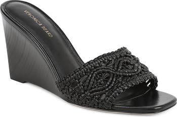 Intricate macramé detailing textures the vamp of this leather slide sandal set on a lofty wedge heel for sculpted height.