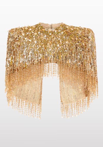 A dramatic capelet delicately draped in cascading embellishment. Designed to shimmer with every movement, it adds texture, light and elegance to any gown, creating a striking sense of fluidity. Perfect for layering over evening silhouettes to elevate formal occasions or red-carpet moments.