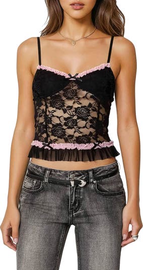 Pastel pink ruffles provide a sweet contrast to the sheer floral lace of a camisole that exemplifies modern romance.