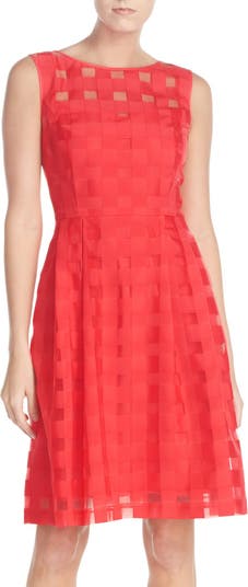 The classic fit-and-flare dress gets an eye-catching update in sheer windowpane checks that conceal and reveal slivers of skin throughout the silhouette.