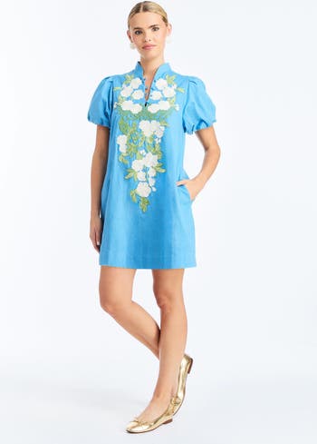V- neck with button closure. Pleated puff sleeves with elasticized cuffs. A-line silhouette. Floral embroidery along CF. Pockets in side seams. Fully lined.