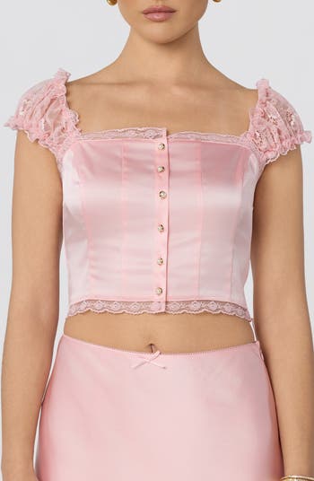 Delicately laced cap sleeves and scalloped trim bring soft romance to this lustrous satin crop top secured with glossy faux-pearl buttons.
