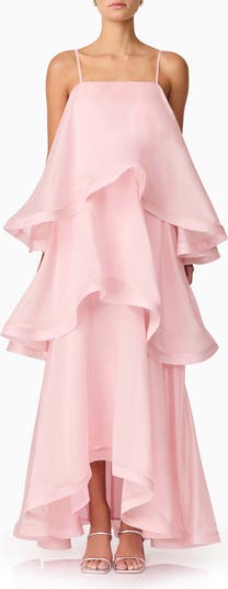 The cascading flared tiers of pink voile evoke the unfurling petals of a flower in this captivating maxi dress that flows with fluttery movement.