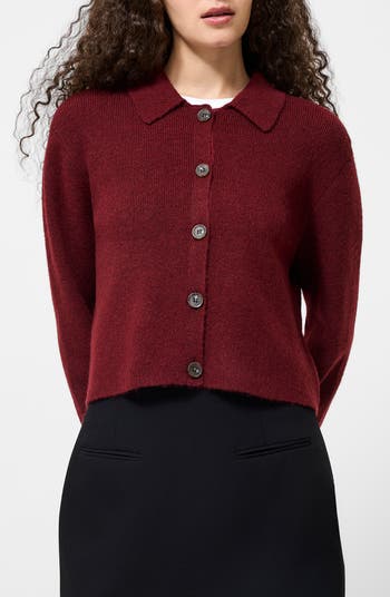 A classic collar enhances the polished style of this easy-to-layer cardigan knit from soft yarns in a playfully cropped silhouette.