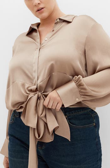 Transition from desk to dinner in this fluid satin button-up shirt framed by gently puffed bishop sleeves and an elegantly gathered tie waist.