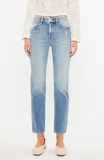 Our Ellie Premier High Rise Straight Jeans are made domestically in small batches by a local wash factory in Los Angeles. Each pair of this denim is single-handily, finely washed in a beautiful medium wash color. Sits above the waist and relaxes throughout the leg for a straight leg fit. Features a 5-pocket style, one button closure, and zip fly. Feel good in these jeans.