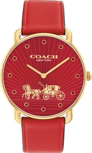 An iconic Horse and Carriage detail brings a heritage touch to this classic round watch featuring a guilloche dial and patterned hour markers. A rich leather strap adjusts for a perfect fit.