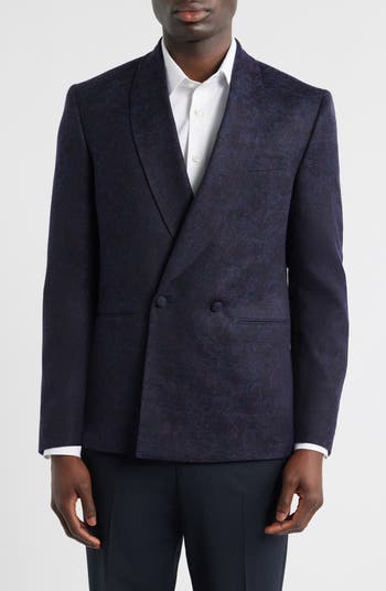 Damask-patterned jacquard in a palette of dark, regal purples brings texture and distinction to a dinner jacket tailored with structured shoulders and a distinctive double-breasted front. A shawl collar and besom pockets add refined detailing that complements any elegant event or special occasion.