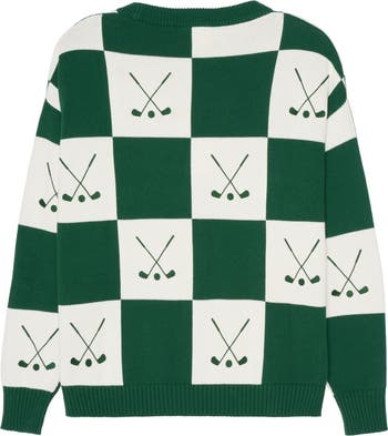 Pattern Play. The Riley Checkered Golf Sweater. A perfectly oversized knit in green and ivory check. Layer it with biker shorts, jeans, or your favorite skirt. Easy enough for anywhere.