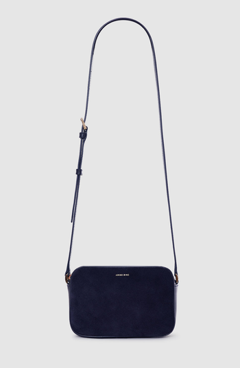 This streamlined camera bag features a structured silhouette with subtle branding and refined hardware for a polished finish. Crafted from 100% leather with navy suede front and back panels.
